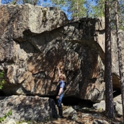 Kalliolta taas järven rantaan – kivien ja juurien ylitys jatkui. Oltiin kävelty kolme kilometriä ja aikaa oli mennyt jo puolitoista tuntia. Tässä vaiheessa aloimme miettiä, kävelisimmekö tosiaan koko kolmen järven kierroksen – siihen saattaisi mennä yli neljä tuntia. Lopulta päätimme, että kurvaamme Ylisen Ritajärven jälkeen takaisin Valkeajärvelle. Ennen Valkeajärvelle saapumista on seuraava taukopaikka, Louhi. Rannassa oleva istuskelupaikka oli varattu, joten kiersimme Louhen ja nousimme sen taakse kalliolle.