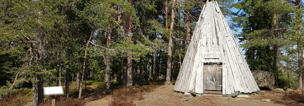 Lopulta lammen rannasta lähdetään nousemaan kohti Rokokallion lakea. Korkeuseroa on noin nelisenkymmentä metriä, mutta nousu on melko loiva, ei siis kovin vaativa. Rinnettä tarpoessa näimme jo kallion laella olevan kodan – ja tunsimme savun tuoksun, joku oli käynyt tulipaikalla vähän ennen meitä.