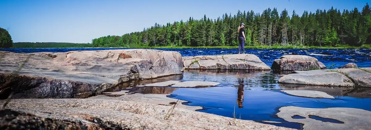 Kallioiden reunalla pääsee kosken aaltoja katsomaan todella läheltä. Koskea tekee melkeinpä mieli koskettaa. On mukava saada olla kuohujen tasolla sen sijaan, että virtaa vain katselisi ylhäältä käsin, kuten monilla muilla koskipaikoilla.