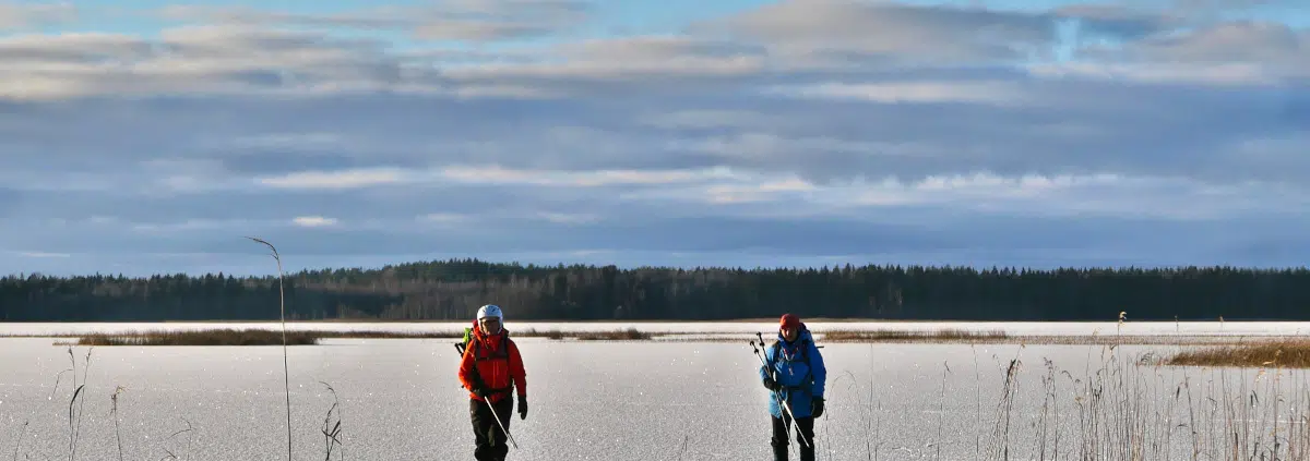 Olemme aikeissa retkiluistella järven ympäri. Paksusta jäästä huolimatta turvavarusteista ei tingitä: selässä on reppu, johon on pakattu vaihtovaatekerta vedenpitäviin pusseihin. Kaulassa roikkuvat naskalit, ja heittoköysikin on viritetty repun päälle tai sivutaskuun helposti käden ulottuville. Sauvoja käytetään jään paksuuden tiedusteluun, vaikka juuri nyt niille ei tunnu olevan lainkaan käyttöä. Jää allamme on niin paksua, ettei siihen saa millään reikää aikaiseksi, vaikka iskisi voimalla samaan paikkaan kerta toisensa jälkeen.