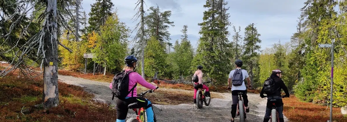 Pyhä-Luoston kansallispuistossa ja sen lähiseutuvilla on aloittelijan silmin varsin mainioita maastopyöräilyreittejä. Pyörän kanssa rullatessa maisemaa näkee hieman eri vinkkelistä, ja muutamankin tunnin rupeamalla saa taitettua pidemmän taipaleen kuin mitä apostolinkyydillä pääsisi. Me otimme vielä rentouden nimissä sähköavusteiset e-fatbiket vuokralle Pyhän keskuksesta, ja mainioiden karttojen ja vinkkien kera lähdimme nauttimaan syyspäivästä tunturissa.