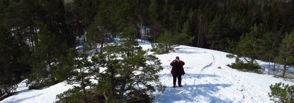 Parkkipaikalta oli puolisen kilometriä mukavaa metsätaivalta vuoren laelle. Kuusikymppinen isäntämies rymisteli lenkkeilemässä metsässä. Hetken ehdin kuvitella hirven rynnivän kimppuumme, kun mies tuli kirjaimellisesti puun takaa.