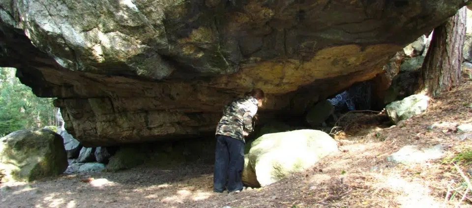 Visuaalisesti jopa kaunis lohkaremuodostelma kätki itseensä pienen ryömittävän onkalon, ja erittäin näyttävän lipan, jonka alta arkeologi oli hakenut sateensuojaa.