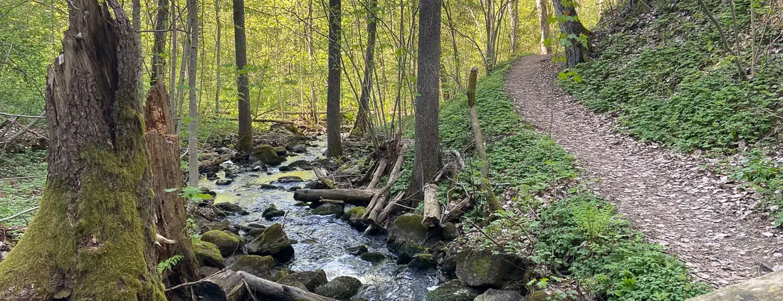Askel eteenpäin, ja historian havina jatkuu. Vanhat kiviportaat johdattavat alas puron äärelle ja sen ylittävälle pienelle sillalle. Opastaulun tarinan mukaan paikalla toimi taannoin, todennäköisesti 1700-luvulla, saha. Nyt siitä on jäljellä enää kasa kivijalkaa ja kiviröykkiöitä sekä röpelöiset kiviraput. Puron varrella kasvaa muun muassa taikinamarjaa, kukkivia käenkaaleja, alvejuuria, runsain mitoin valkovuokkoja ja jopa muutamia harvinaisuuksia, keltavuokkoja. Vastapäinen kalliorinne kohoaa korkeuksiin. Paikka on kauneudessaan vaikuttava.