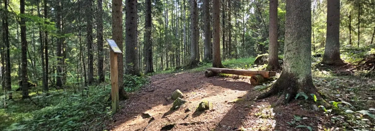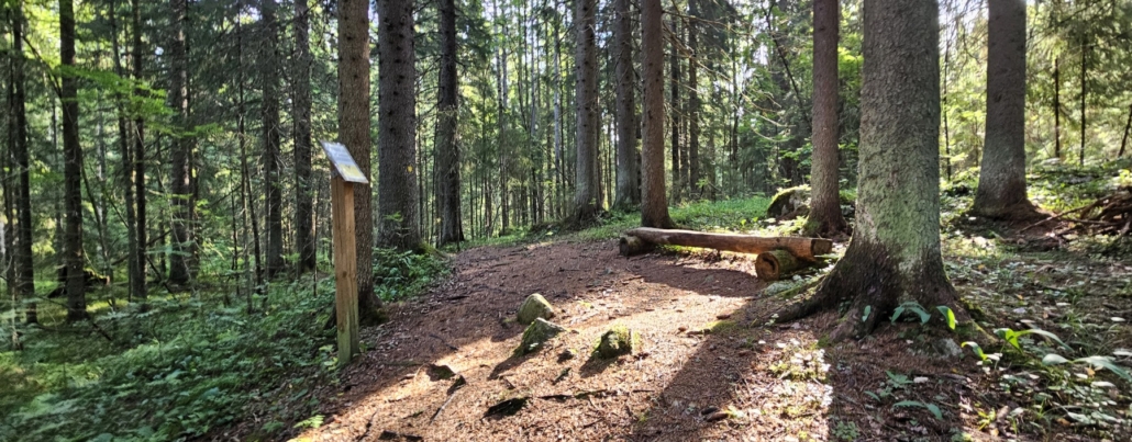 Muutaman kymmenen metrin siirtymäpolku vie luontopolun aloituspisteeseen. Tässä on pari yksinkertaista penkkiä sekä opastaulu. Penkit olivat varjoisassa paikassa, mutta täytyy kyllä myöntää, että tämän reitin varrella ei aurinkoa juuri näe – koko polku kulkee metsän suojassa.