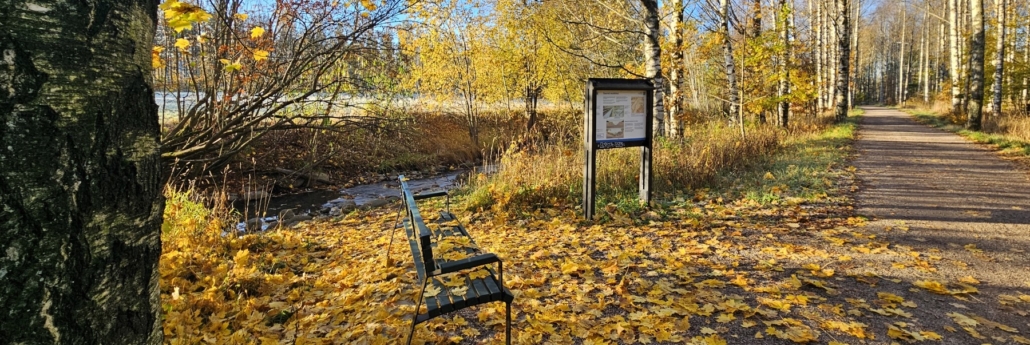 Ja reitti päättyy Vantaanjoen rantaan viimeiselle kyltille. Tai ensimmäiselle, jos päätät kävellä reitin toisin päin. Aikaa kävelyyni meni reilu tunti ja matkaa kertyi noin 2,5 kilometriä.