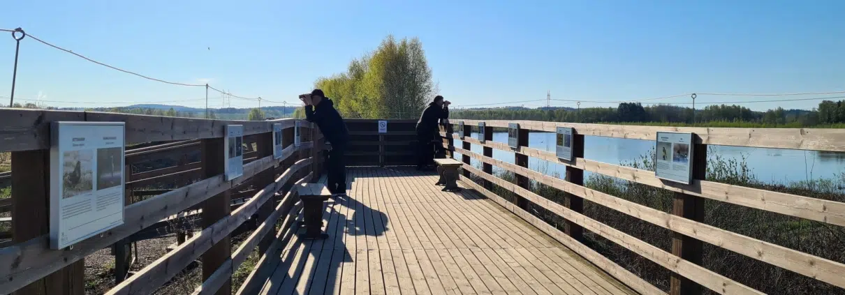 Viihdyimme lavalla pitkän tovin. Lintuja voi tarkkailla joka suuntaan. Vesialueilla näkyi telkkiä, härkälintuja, tukkasotkia, joutsenia.
