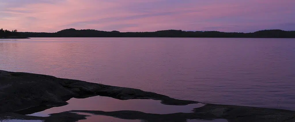 Täällä kelpasi laittaa teltta pystyyn ja nauttia iltapalaa kesäyön hämyssä. Hengitimme hiljaisuutta laskevan auringon maalatessa Luonterin saaristoa lilan ja violetin eri sävyihin. Rantakallioiden vesilammikoista taivaan valot heijastuivat edelleen hieman tummempina, ja taustalla kalliosaaret maalautuivat punaisen, ruskean ja mustan eri kuoseihin.