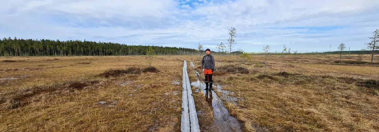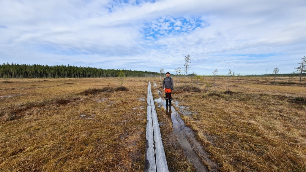 Alkumatka on oikeastaan aika tasaista kangasmaaston ja avosuo-osuuksien vuorottelua. Parisataa metriä kumpaakin vuorotellen. Ensimmäinen suopätkä menossa. Pitkospuut olivat täällä hyvässä kunnossa. Metsähallituksen esitteessä luki, että ne kunnostetaan vuonna 2021. (Eli teksti oli hieman vanhentunutta, mutta pitkokset ilmeisesti neljän vuoden ikäiset)