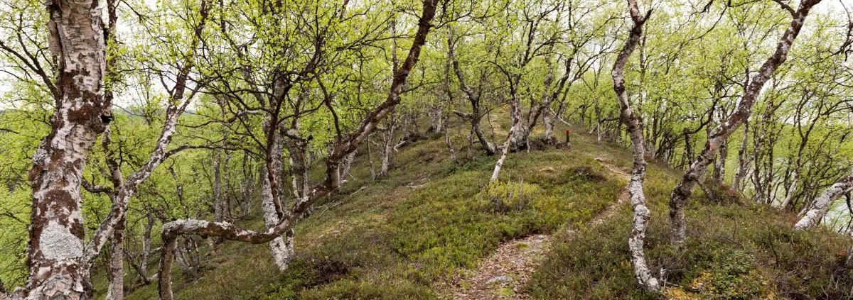 Harjun laella kasvavat käkkyräiset tunturikoivut luovat ympärille vaaleanvihreän satumetsän.