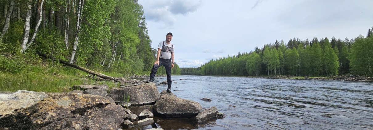 Olisikohan tämä pienen saaren rannan puoleinen uoma juuri muokattu – selkäni takana oli selvä hiekka- ja kivikasa. Ajattelin, että tähän on ehkä haluttu muodostaa rauhaisampi uoma vuolaan kosken viereen, esimerkiksi kalojen kutupaikaksi.