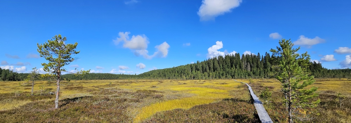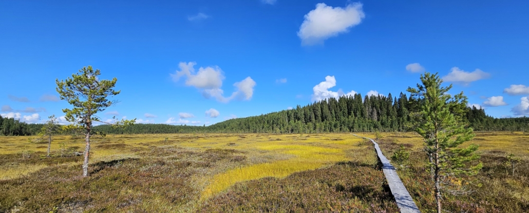 Seuraavan pitkospätkän ympärillä oli mielestäni koko suon hienoimmat värit. Pehmoiset poutapilvet kruunasivat maiseman.