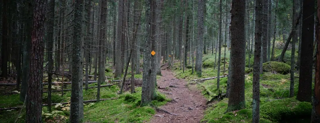 Knutersin reitti sukeltaa heti mukavaan havumetsään, jossa näkyy myös lehtipuita. Tosiaan, vielä kuuluu lehtien havina puissa, vaikka osa keltaisista lehdistä leijaileekin tuulen mukana puiden lomassa. Polun yli on kaatunut mahtavan iso keloontunut kuusi, ja polku onkin jo ottanut uuden uran kannon ympäri. Ihailemme hetken komeaa kelorunkoa ja lähdemme sitten kipuamaan ylämäkeen.