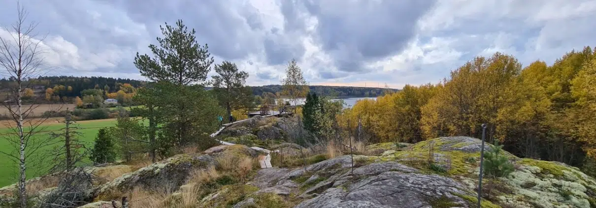 Katselulava. Maisema avautuu pohjoiseen ja koilliseen. Peltojen lisäksi maisemassa näkyy idän suunnalla komea keltainen kartano, ilmeisesti Gåsarv. Se jää hieman kuvan ulkopuolelle, mutta näkyy blogin pääkuvassa. Pääkuva on otettu toisen katselulavan lähellä – se oli vain muutaman kymmenen metrin päässä tästä ensimmäisestä lavasta. Toisen lavan maisema avautuu enemmän itään ja kaakkoon. Myös Tjusträskin järvi näkyy pääkuvassa.