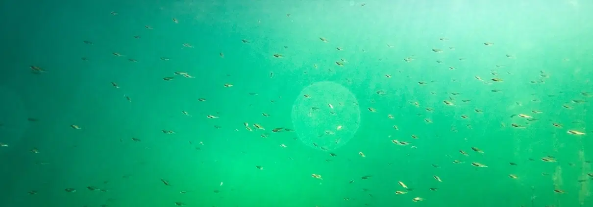 Kesä on lämmittänyt vedet mukavasti, eikä veden varaan kellahtaminen saanut ainakaan kylmän vuoksi haukkomaan happea. Maisema pinnan alla oli kuitenkin niin hieno, että tiesin heti, että tästä tulisi mukava reissu. Laskeuduin keskelle jättimäistä pikkukalaparvea.