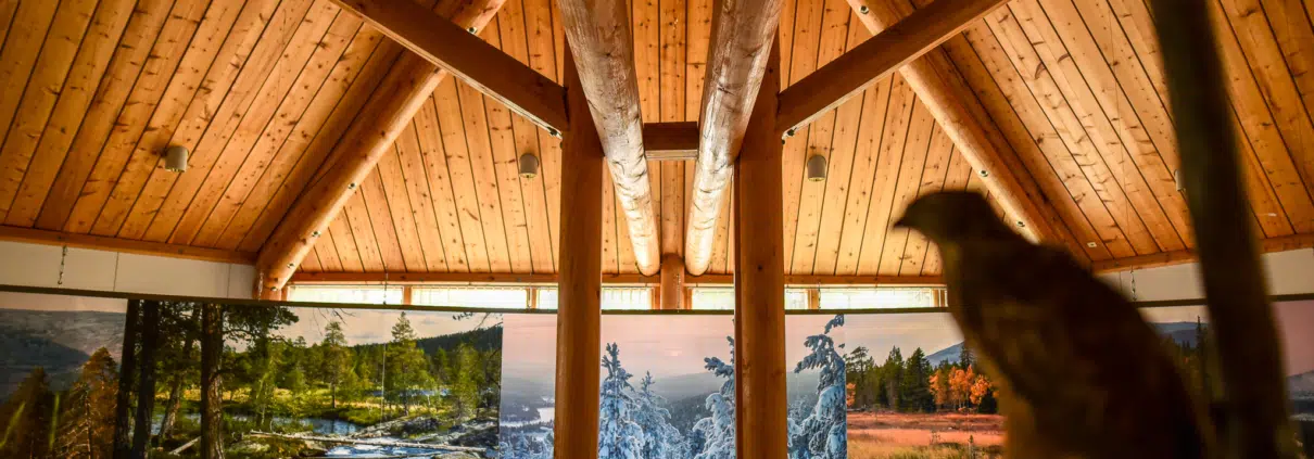 Korkea tila on henkeäsalpaava jo itsessään, ja sitä kannattelevat valtavat kokonaiset puunrungot, jotka ovat peräisin Rovaniemeltä vuoden 1982 Mauri-myrskyn kaatamista puista. Talon lattia on Lokan liuskekiveä, ja yläkertaan johtavat rappuset on tehty Savukosken savuparketista. Paikallisuus on läsnä niin rakenteissa kuin myös sen henkeä kunnioittavassa näyttelyssä.