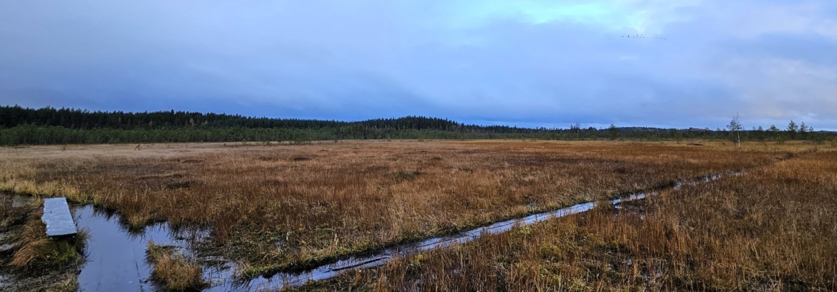 Suon keskellä on risteys, jossa on myös reitin ainoa istuskelupaikka, melko kulunut penkki. Lokakuussa 2025 kaikki ympäröivät pitkokset olivat veden alla. Silloin päätin lopettaa kierrokseni tähän ja palasin ”kuivalle maalle” vasemmalle kääntyvää polkua pitkin. Vaellussauvan avulla pystyin kävelemään vakaasti, vaikka pitkokset olivat pitkän matkaa veden varassa.