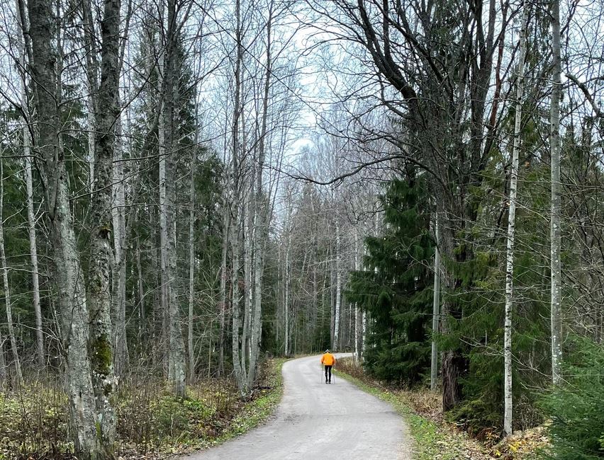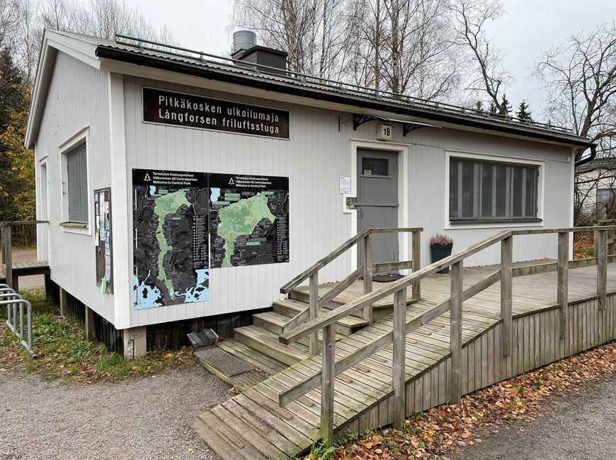 Rinnelehdosta jatkoin matkaani hiekkapintaista ulkoilutietä pitkin perinteikkäälle Pitkäkosken majalle. Toiveena oli päästä maistamaan majan legendaarisia munkkeja. Maja oli kuitenkin kiinni, aukioloaikoja kerrottiin päivitettävän majan FB-sivuilla. Pitkäkosken majalta on valittavana useita reittejä takaisin Paloheinään. Päätin edetä vanhinta ja varmaan käytetyintä pääreittiä pitkin, joka sitten jatkuu Pirkkolaan ja edelleen Helsingin Keskuspuiston eteläisimpiin osiin asti. Eipä täälläkään liikaa ruuhkaa ollut, kahden kilometrin matkalla pari pyöräilijää tuli vastaan ja rullasuksihiihtäjä meni ohitseni pitkässä, loivassa alamäessä.