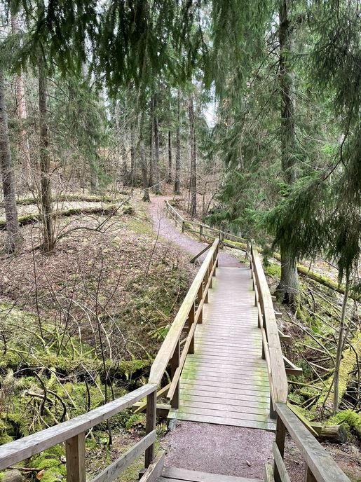 En kävellyt Siimespolkua ihan loppuun asti, vaan suuntasin muita polkuja pitkin kohti Haltialan aarnialuetta. Aarnialueen metsät olivat suojeltuja jo silloin, kun nuorena poikana lenkkeilin täällä. Ei siis ihme, että aarnialueen metsä on tänä päivänä todella komeaa luonnonmetsää, jossa metsien uhanalaisille lajeille elintärkeää lahoavaa puuta on runsaasti. Maaston kulumisen ehkäisemiseksi kulkijoita pyydetään – minusta ihan oikein ja perustellusti – liikkumaan vain jalkaisin ja pysymään merkityillä poluilla. Polku osoittautuikin vastikään rakennetuksi hienoksi polkusillaksi. Täälläkään ei ketään tullut vastaan, joten sain fiilistellä aarnialueen lumoavaa vanhaa metsää ihan rauhassa, yhdessä mahtikuusessa mekastavien korppien kanssa.