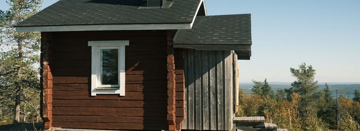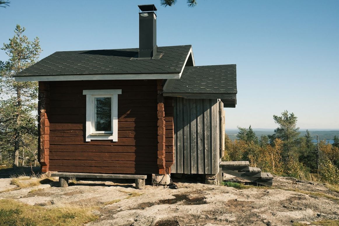 Huipulla odottaa soma päivätupa ja siihen kuuluva pihapiiri kuten asiaan kuuluu. Entinen palovartijan maja on muuten pultattu kallioon kulmistaan, joten tunturituuli tai vaikeat sääolosuhteet eivät sitä hetkauta. On kaunis päivä, mutta sisällä istuessa huipun tuuli humisee silti hirsiseinissä.