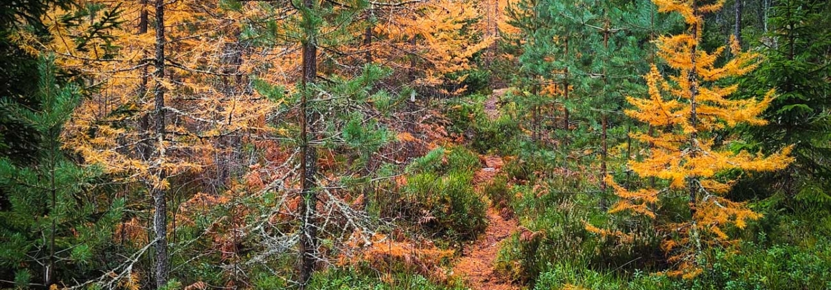 Osa pienemmistä kuusipuista oli saanut kauniin kultaisen väripuvun. Maastosta löytyi kuitenkin vielä paljon vihreää, vaikka ollaan jo lokakuussa. Pysähdyimme muutamaan otteeseen kuuntelemaan tikan nakutusta ja bongasimmekin muutaman tikan retken aikana.