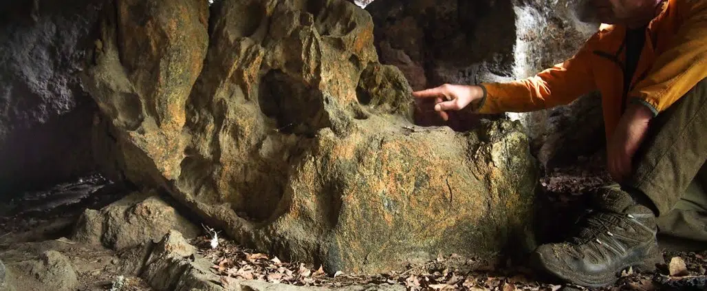 Mäen luoteispuolella, kosteikon vieressä ja pienen kohouman päällä, on suuri ja upea siirtolohkare löytänyt paikansa. Lohkare on hieman kallellaan pienempien lohkareiden varassa, ja näin on päässyt muodostumaan iso ja hämärä luola. Mutta yllätys on vielä suurempi, kun luolan keskellä seisoo jotain, mitä tähän mennessä ei ole tullut vastaan: tafonikivi!