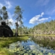 Polku kulkee kallioiden välissä kangasrämeellä.