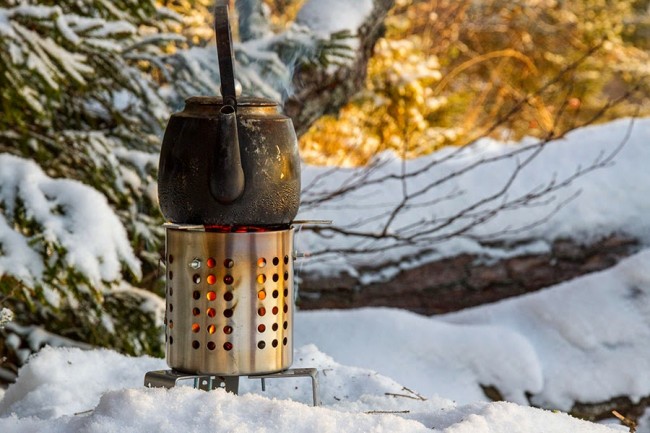 Kaffepannuun vettä lämpenemään ja risukeittimeen kuivia kuusenrisuja ja mukaan lähtenyt kourallinen tammipalikoita, joita tuttu puuseppä lahjoitti banaanilaatikolisen.