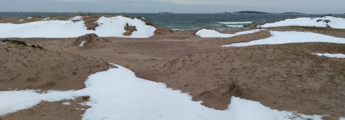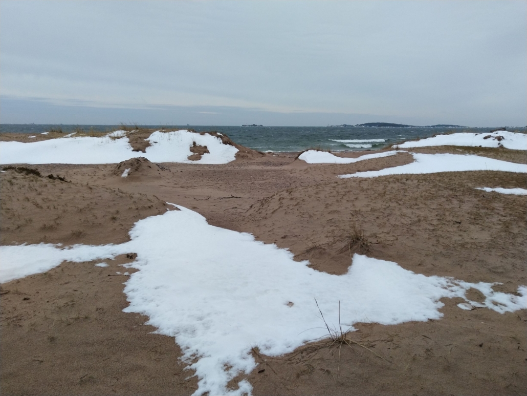 Aloitin retken Tulliniemen itäpuolen uimarannalta. Alue on teollisuusalueen ja merivartioaseman aitoihin ja mereen rajautuva kapea, parisen kilometriä pitkä alue. Rantakaistale oli miltei lumeton rantaa seurailevaan dyynivalliin saakka. Vallin takana olevassa painanteessa lunta oli paikoin kinostunut – samaan tapaan kuin hiekkaa – sen verran paljolti, etten luottanut vaelluskenkieni varren pituuteen, vaan kiersin lumisimmat kohdat. Lumen lisäksi valkoista oli nähtävissä meren vaahtoharjoina.