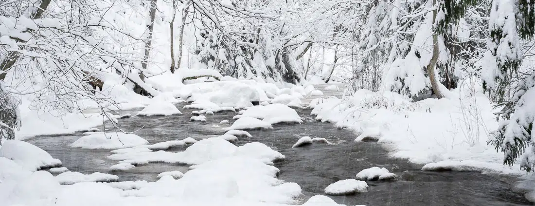 Matkalla takaisin autolleni nautin hurmaavasta ja rauhallisesta jokimaisemasta. Olin ihan yksin ja se oli ihanteellista. Etsin koko ajan lumen veistämää taidetta maisemasta. Yksi puu oli kaartunut 90 astetta muodostamaan kaaren. Hitaasti virtaavat, mutta vielä jäättömät paikat heijastivat talvimetsää tummassa vedessä.