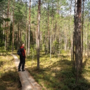 Tie johdatti rantaa kohti, ohi golfkenttien. Lumi oli edellisen viikon aikana sulanut ohueksi ja paikoin jäiseksi kerrokseksi poluille. Onneksi jäinen tie vaihtui pian metsäisemmäksi ja askel rennoksi.