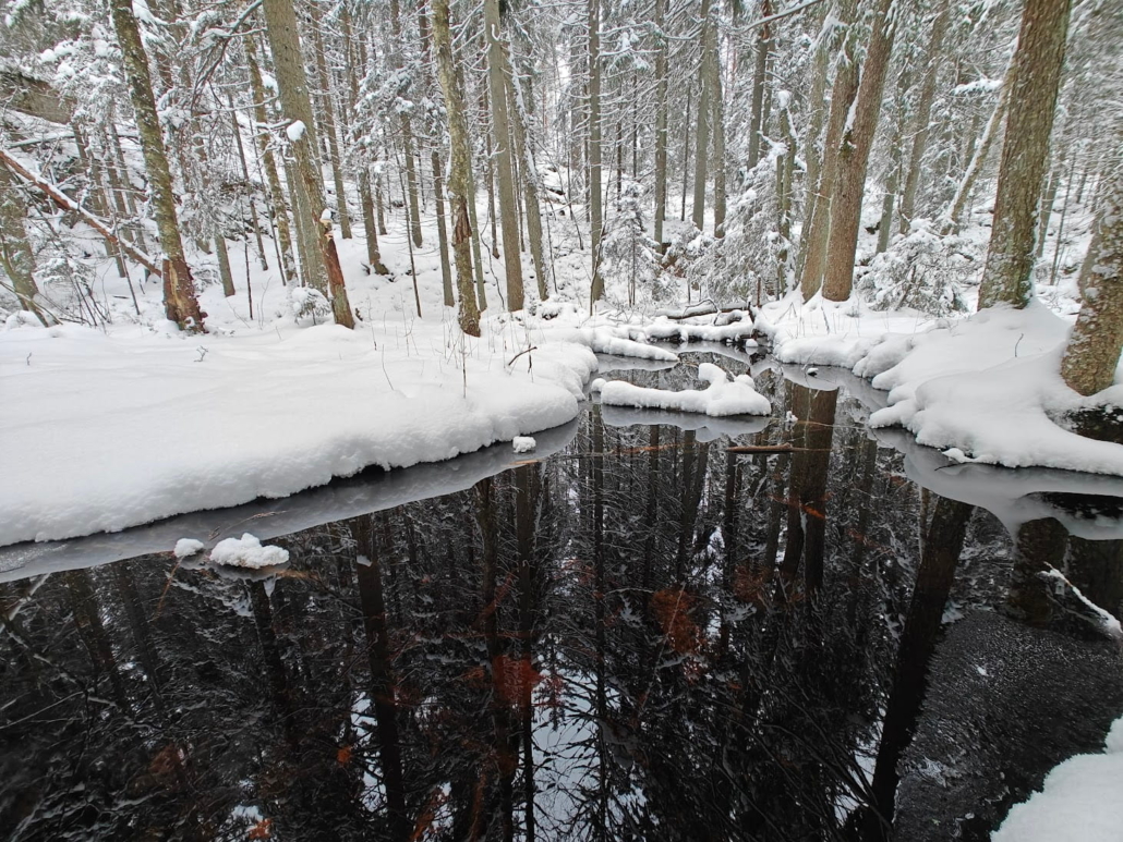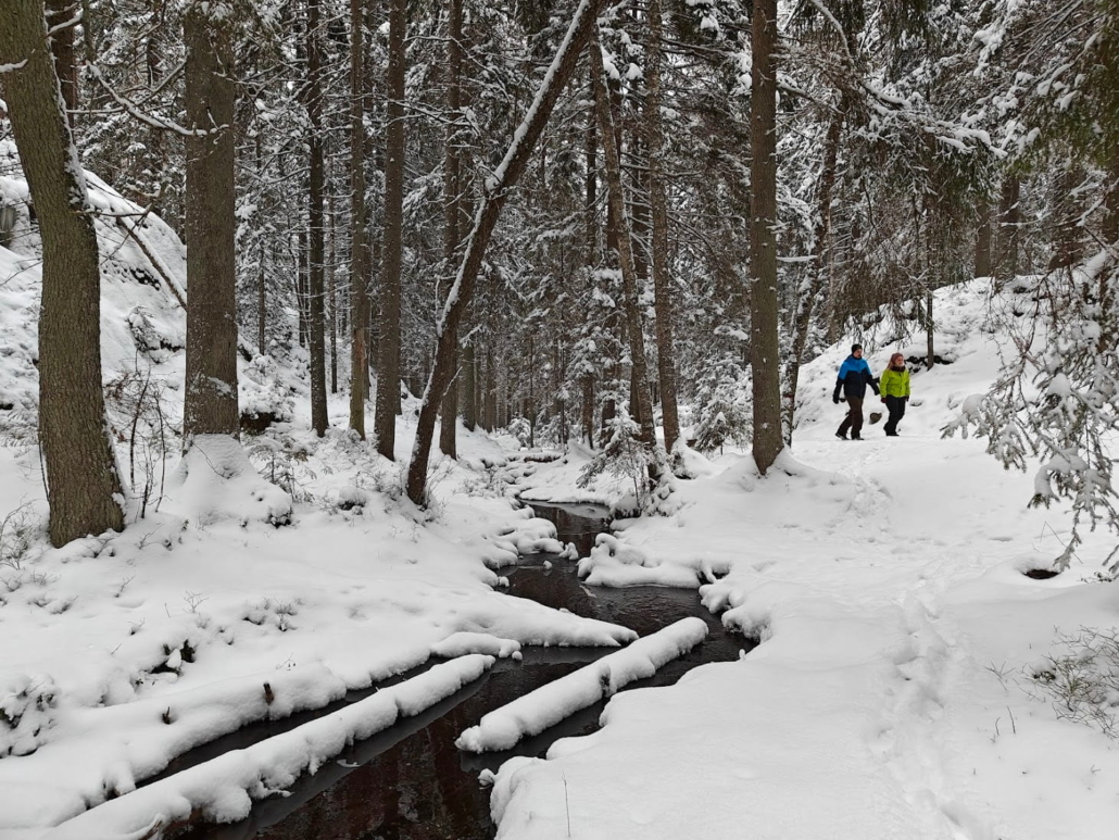 Yksi retken hienoimmista hetkistä syntyy usein, kun pysähtyy. Purojen solinaa voit Nuuksiossa kuulla talvellakin, ja metsän hiljaisuus on parhaimmillaan lähes käsin kosketeltavaa. Lumipeite tuntuu peittelevän alleen niin äänet kuin ajankulunkin. Tätä kaikkea kauneutta ja rauhaa kannattaa ihan tietoisesti ihailla. On jopa tutkittu, että luonnosta saa hyvinvointia tehokkaammin, kun pysähtyy ihailemaan kaikkea kaunista ja ihmeellistä sen sijaan, että vain porhaltaa menemään.