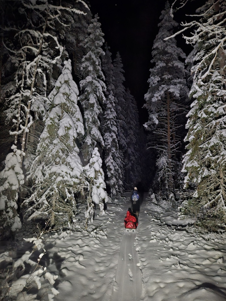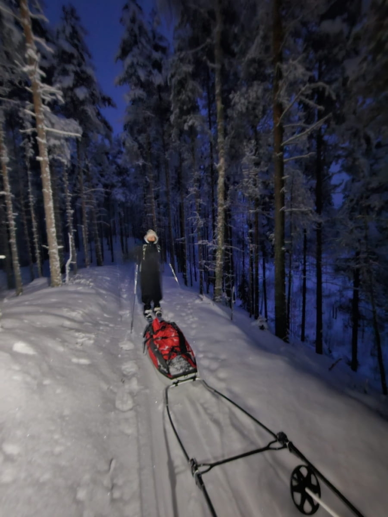Pakkasimme autoon kaiken tarvittavan: kaksi paria liukulumikenkiä sauvoineen, ahkion, keittimet, retkiruoat ja tietysti kunnon herkkueväät. Varustauduimme kylmään huolella: kaksi makuupussia per henkilö, ilmapatjat, solumuovit ja todella paksusti vaatetta. Otin mukaan myös taljan tuomaan lisäeristystä.