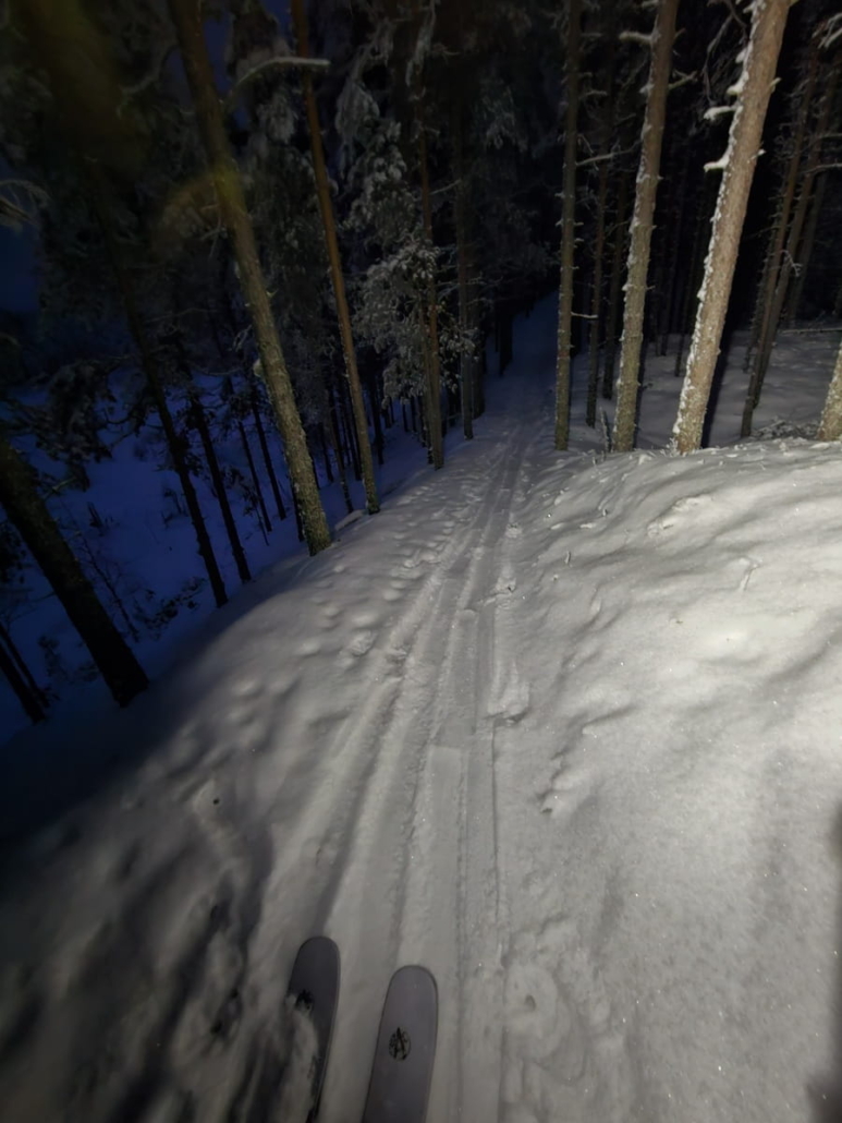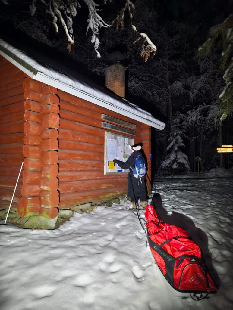 Pääsimme perille Arpaistenkämpän parkkipaikalle vasta puolenyön maissa. Tie oli auraamaton ja paksun lumen peitossa, joten neliveto tuli tarpeeseen – omalla autollani en olisi uskaltanut edes yrittää. Toivoimme vain, ettei tuvassa olisi ketään nukkumassa, jotta emme häiritsisi ketään kolistelullamme. Onneksemme tupa oli tyhjä.