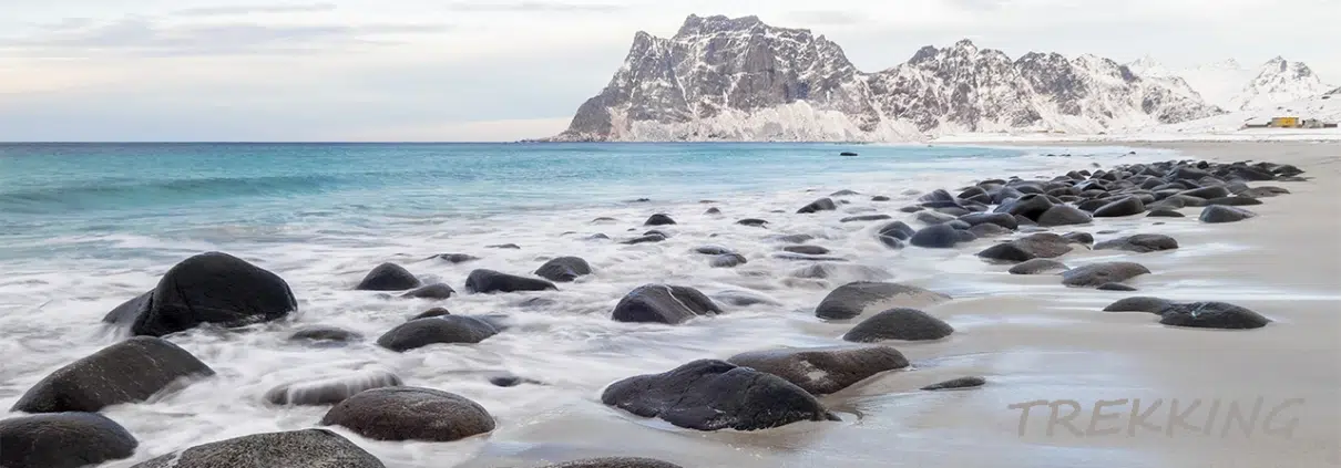 Keskipäivän aurinko ei myöskään välttämättä vielä helmikuussa ulotu kovinkaan laajalle alueelle laaksojen pohjilla, mutta etenkään aurinkoisella ilmalla se ei haittaa, koska valoa silti riittää kyllä hyvin kuvaamiseen. Yllä mainingit murtuvat Flakstadin hiekkarannalle tuulen piiskatessa kuohuja päinvastaiseen suuntaan.