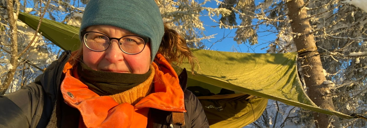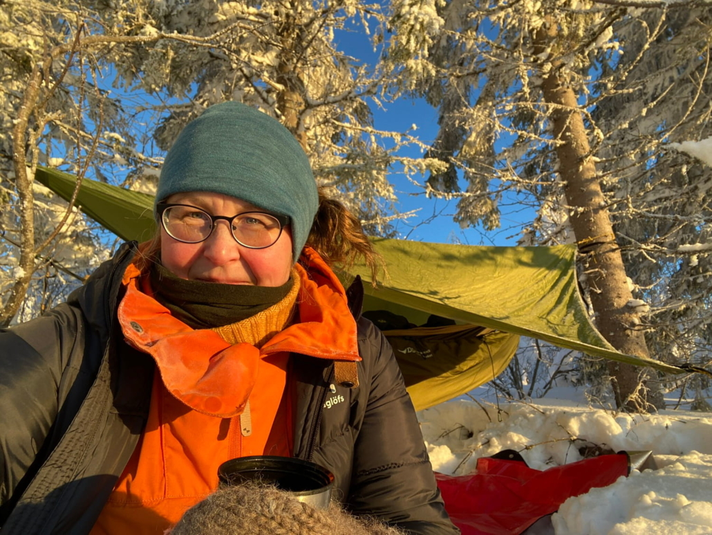 Marja toteaa, että riippumatto ei ole paras yöpymisvaruste pakkasella.