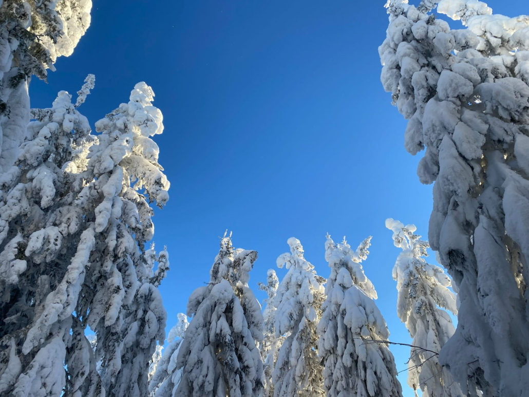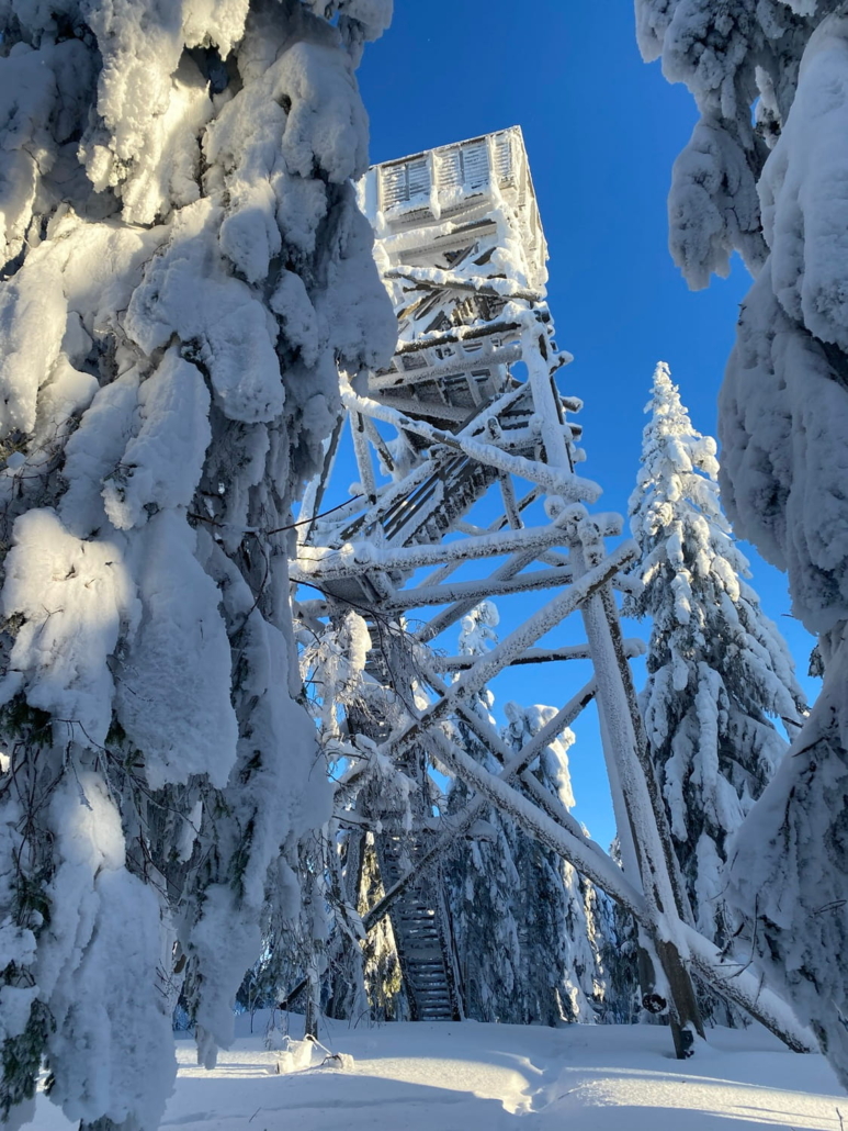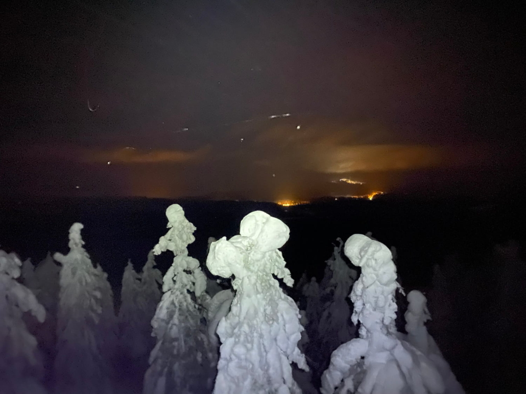– Kävellessäni kohti Räsävaaraa, taivas kirkastui muutaman kerran ja kuu ja tähdet tulivat esille, mutta sää pilvistyi nopeasti uudestaan. Lähtiessäni kapuamaan viimeistä polkua ylös vaaran juurelle mietin jo, että ei kyllä yöpyminen tornissa tai vaaran päällä onnistu: tuuli puhalsi puuskissa niin voimakkaasti, että sain muutaman kerran kunnon lumipesun, kun tuuli pudotti lunta puista. Sinnikkäästi kuitenkin jatkoin tornille saakka, vaikka sinne menevää polkuakaan ei välillä meinannut erottaa, Marja muistelee.