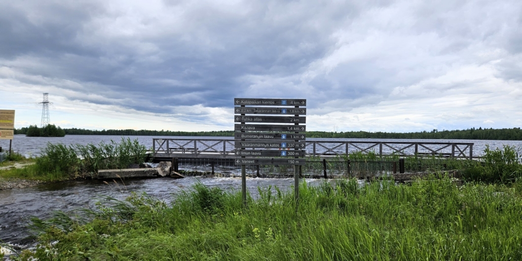 Lähtöpaikalla on myös lyhyt mutta kivasti kuohuva koski. Reitin voi kiertää molempiin suuntiin, lähdin vaistomaisesti vastapäivään. Tällöin koski ylitetään siltaa pitkin – tai takana näkyvää laituria pitkin. Rakenteita on varmasti tehty niin kalastajien kuin kävelijöidenkin tarpeita ajatellen.