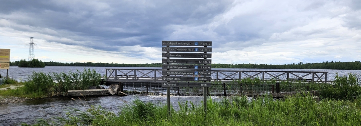 Laavun jälkeen ohitetaan puomi ja matka jatkuu kala-altaan rantaa pitkin.