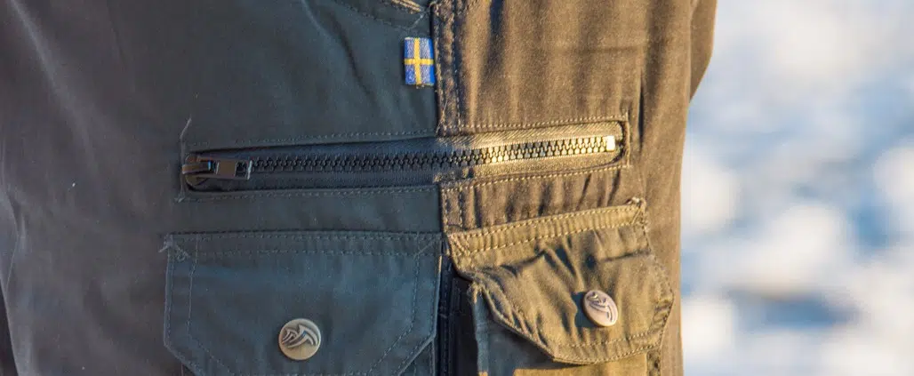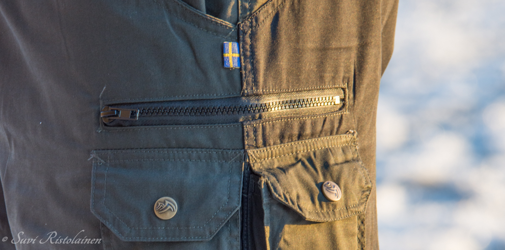 Eräällä kuvausreissulla astuin hiekkapohjaiseen puroon luullen pohjan olevan tukeva. Upposin kuitenkin lähes puoleen sääreen veteen. Muutaman sekunnin kuluttua pääsin ylös purosta ja kokeilin lahkeita. Vesi valui pintakankaasta pois eikä se jäänyt juurikaan märäksi. Kangas on vahaamatonta mutta silti se tuntuu pitävän vettä varsin kohtuullisesti.