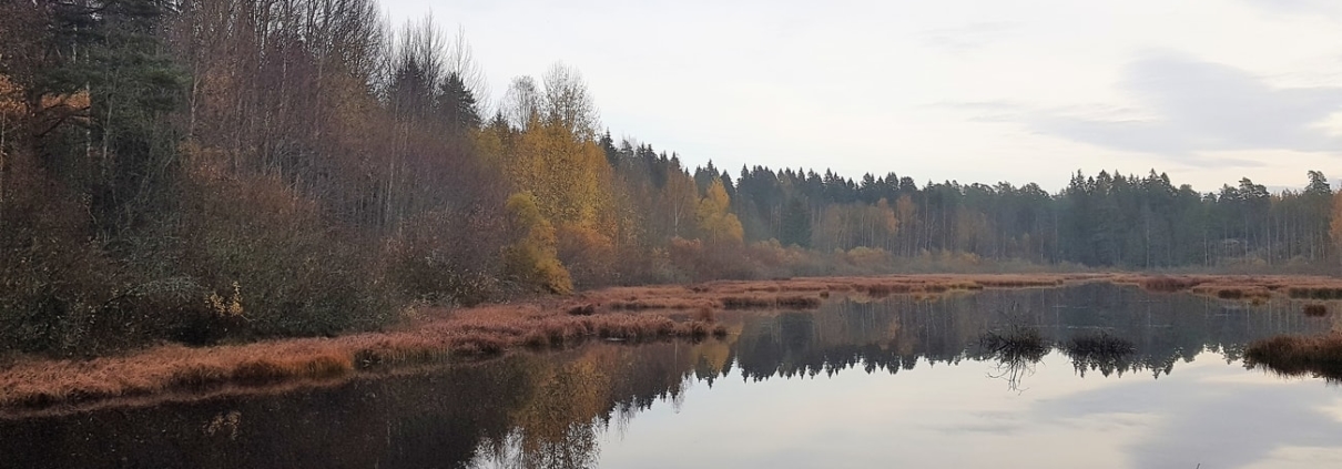 Asia selvisi vasta, kun lähestyimme reitin virallista lähtöpistettä. No, totesin heti, että tulisin kävelemään tuon puuttuvan osuuden (noin kilometri) ensi vuonna. Nyt kävelimme lähtöpisteelle ja sieltä eteenpäin reitin ykkösrastille eli Mössenkärrin lammelle. Lammen rannassa oli kaksi penkkiä, istahdimme toiselle niistä pienelle kahvi- ja leipätauolle. Telkkä sukelteli parinkymmenen metrin päässä. Kuinka paljon täällä mahtaakaan olla lintuja kesällä? Täytyy ottaa selvää.