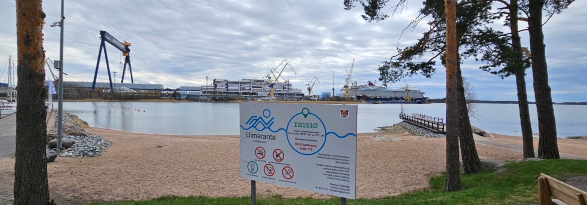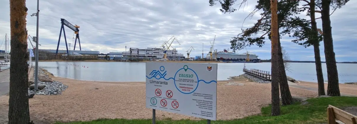 Kierros päättyy sorakuoppien jälkeen. Palaillaan hiekkarannan tuntumaan. Täällä voi vielä ihastella Pernon telakkaa ja siellä rakennusvaiheessa olevia laivoja. Jos oikein ymmärsin, niin kuvassa näkyvä laiva on TUI Cruises-varustamon alus, joka valmistuu tänä vuonna (2024). Myös Royal Caribbeanin Star of the Seas on rakenteilla, valmistuu 2025.