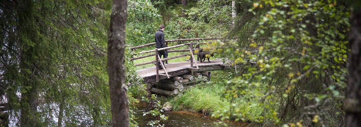 Kävelimme mieheni ja koiramme kanssa hetken aikaa Hakoharjun metsiä halkovaa polkua, ja laskeuduttuamme jyrkkää rinnettä ja sen puista portaikkoa alas, tulimme sillalle.