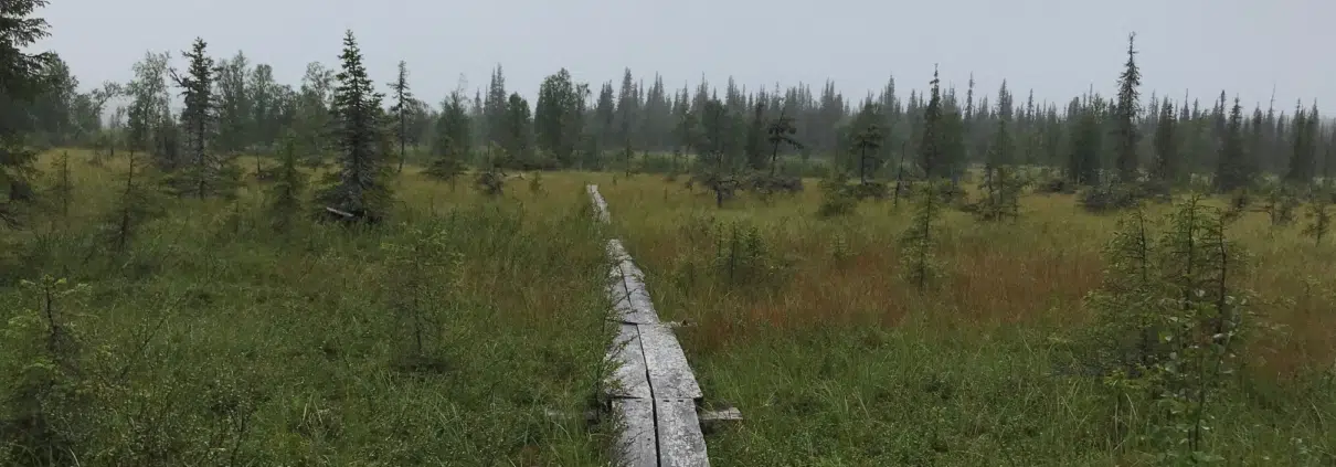Ennen Murhahaaran autiotupaa teemme todella hämmästyttävän löydön. Pitkospuiden sivuun on aseteltu jeesusteipillä vuorattu tohvelipari. Miksi joku on raahannut tohvelit erämaahan? Ovatko ne jonkun leirinkengät ja miksi ne on vuorattu teipillä? Kantapäät kastuvat joka tapauksessa. Hoi, jos unohdit tohvelisi Tuntsalle, siellä ne nyt edelleen ovat!