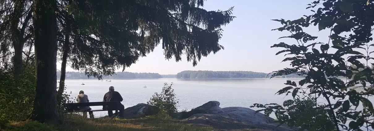 Ja lopuksi niemen kärkeen. Olipa kaunis aamu. Tyyni, lämmin, kirkas. Järvellä näkyi veneitä ja kivillä päivystäviä lokkeja. Niemessä on melko paljon penkkejä. Ulkoilijoita ja upeasta säästä nauttivia ihmisiä riitti joka penkille (kuten reitin esittelykuvassa näkyi).