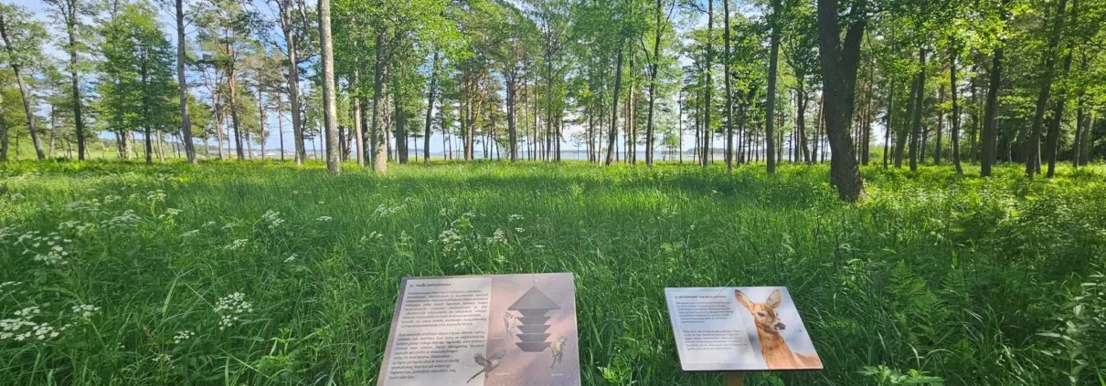 Tässä on myös paljon infotauluja, aiheina mm. kangaskiuru, metsäkauris, merikotka ja tässä kuvassa näkyvä laulujoutsen. Aloimme miettiä, pääsisimmekö reitillä ollenkaan rantaan.