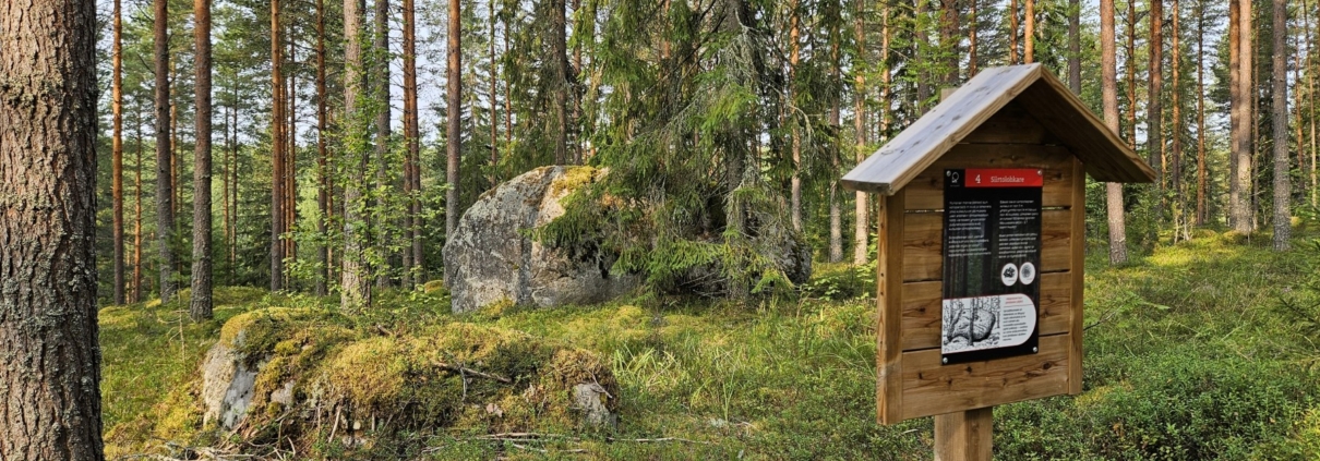 Reitti kulkee hitaasti kohti Tyyrinvuorta. Taulut kertovat mm. siirtolohkareista (blogin pääkuva), uudistusalasta ja kalliojyrkänteestä. Kohta ollaan jo Tyyrinvuoren laen tuntumassa.