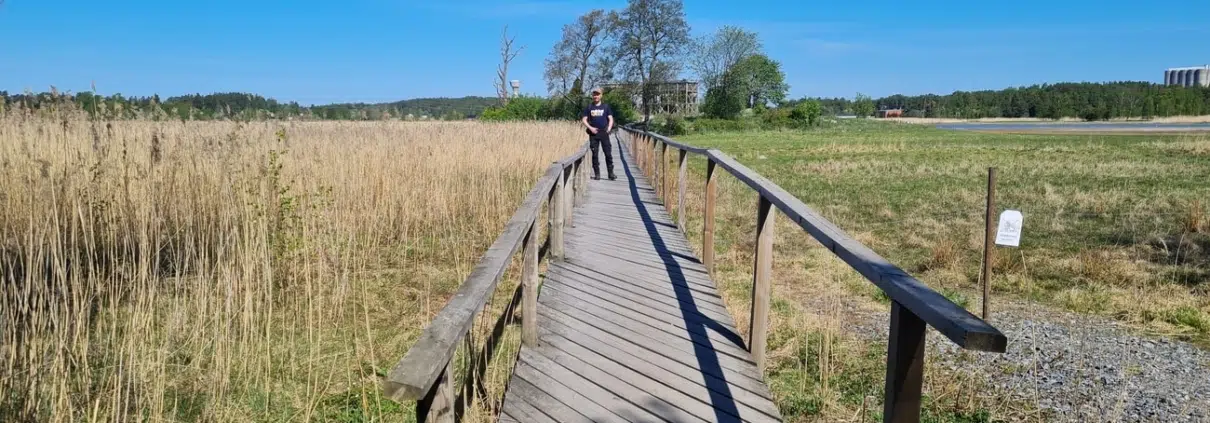 Muutama sata metriä asfaltoitua väylää pitkin. Rantametsikössä kuului satakielen ääni, ei kuitenkaan saatu siitä näköhavaintoa, vaikka paikalle pysähtyneen pyöräilijän kanssa kilvan sitä yritimme bongata. Kävelyä oli takana aika tasan kilometri kun saavuimme lintutornin luokse. Sinne johtaa komea puinen silta. Infotaulu kertoo ruovikon linnuista – kerttusista, pajusirkusta ja viiksitimalista.
