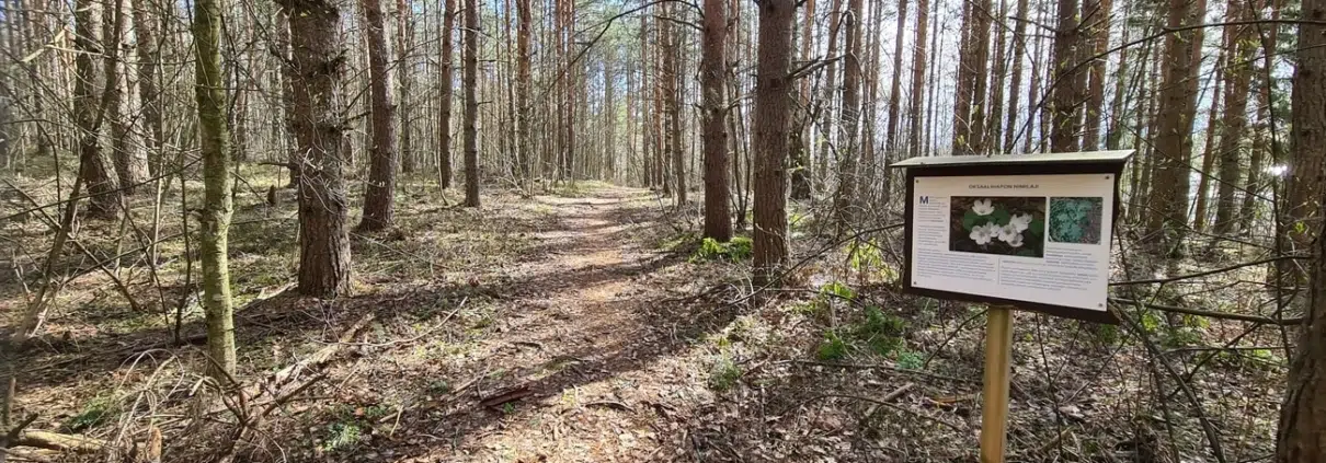 Mäen päällä reitti kurvaa vasemmalle eli takaisin kohti itää. Käenkaalista kertovan infotaulun kohdalla ihailin täällä juuri puhkeavaa kevään vihreyttä. Tuomissa oli jo pienet lehdet, koiranputket työnsivät jo ensimmäisiä lehtiään, mutta olivat vain muutaman sentin korkuisia taimia.
