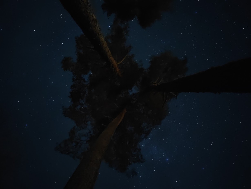 Omenapuiden ja mäntyjen siluetit nousevat mustina korkeuksiin ympärilläni, ja erotan ne näkökentässäni vain vaivoin. Suoraan kohti katsomalla ei näe mitään – täydellisessä pimeydessä kuljetaan sivusilmällä katsoen. Astellessani aina välillä hieman eteenpäin, annan kuudennen aistini paiskia hartiavoimin töitä. Sen avulla en törmää pimeyteen piiloutuneisiin oksiin, ja askeleetkin pysyvät vakaina, vaikken näekään maan pieniä epätasaisuuksia edessäni.